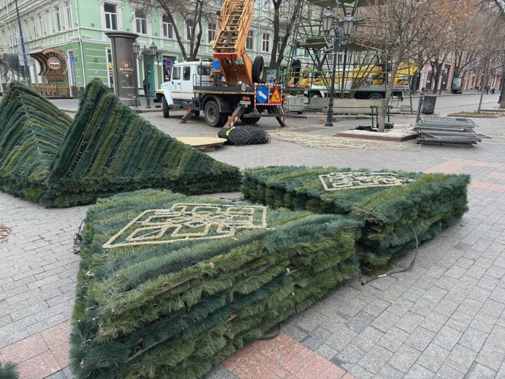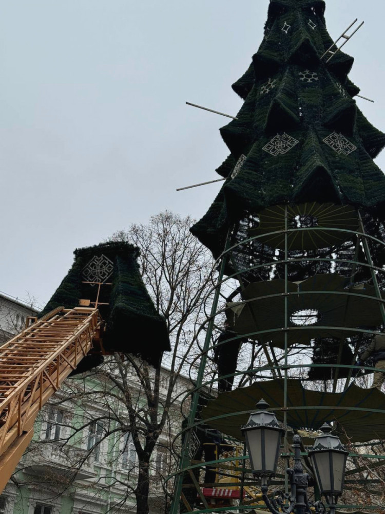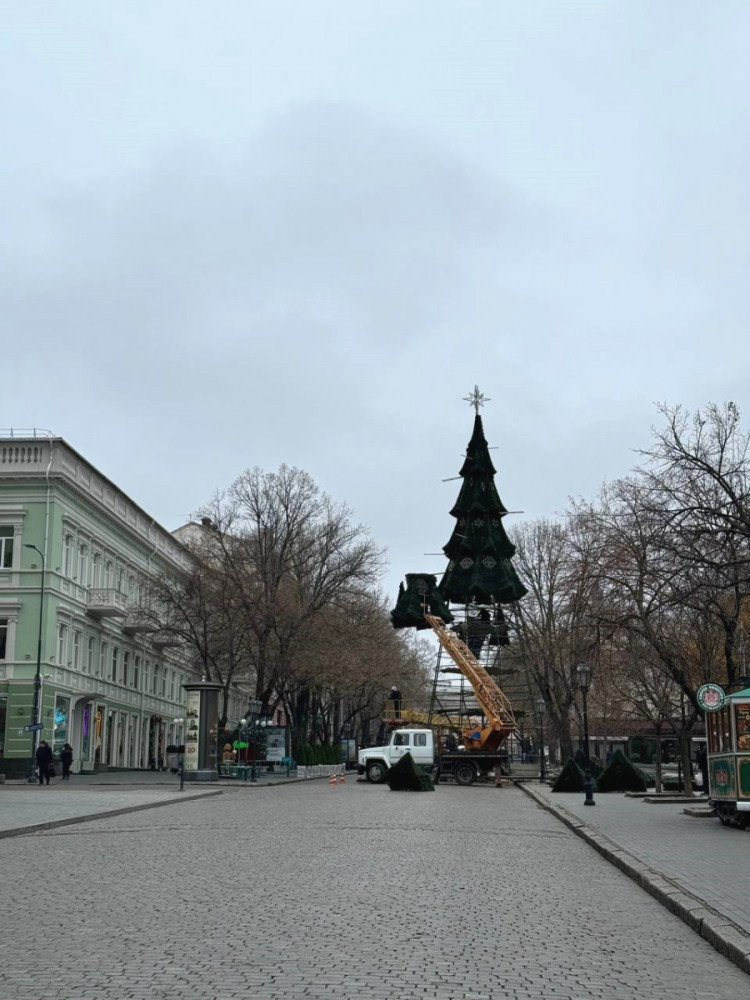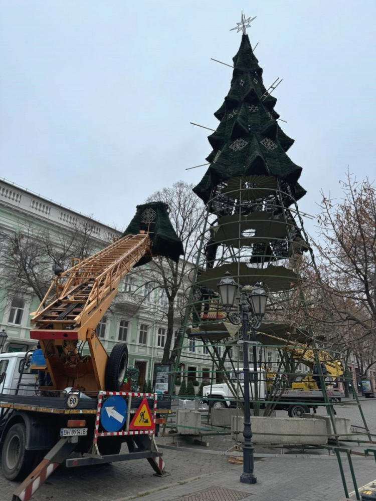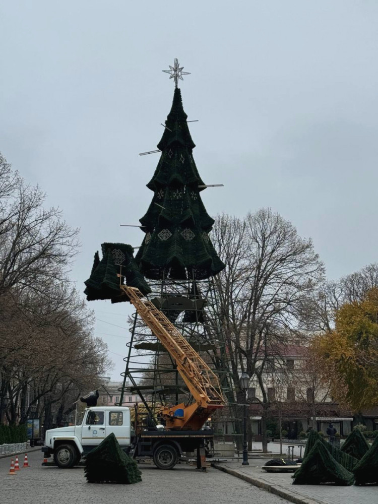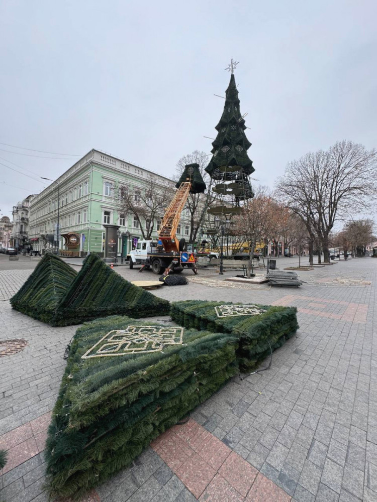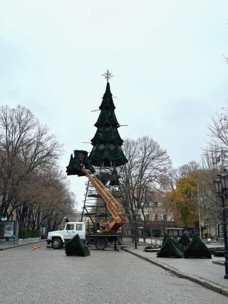 В Одессе продолжается подготовка к новогодним и рождественским праздникам. Вчера коммунальные службы начали монтаж главной елки города на улице Дерибасовской.