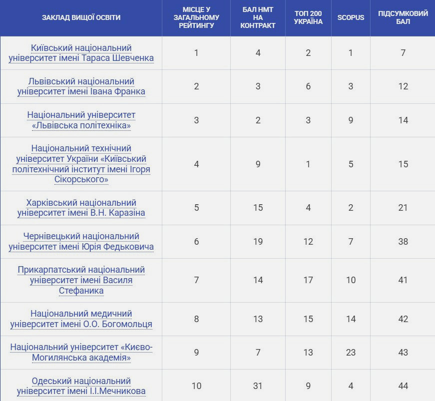 Для составления данного рейтинга используются данные самых авторитетных национальных рейтингов, таких как «Топ-200 Украина», «Scopus» и «Бал НМТ на контракт», каждый из которых использует различные критерии оценки.