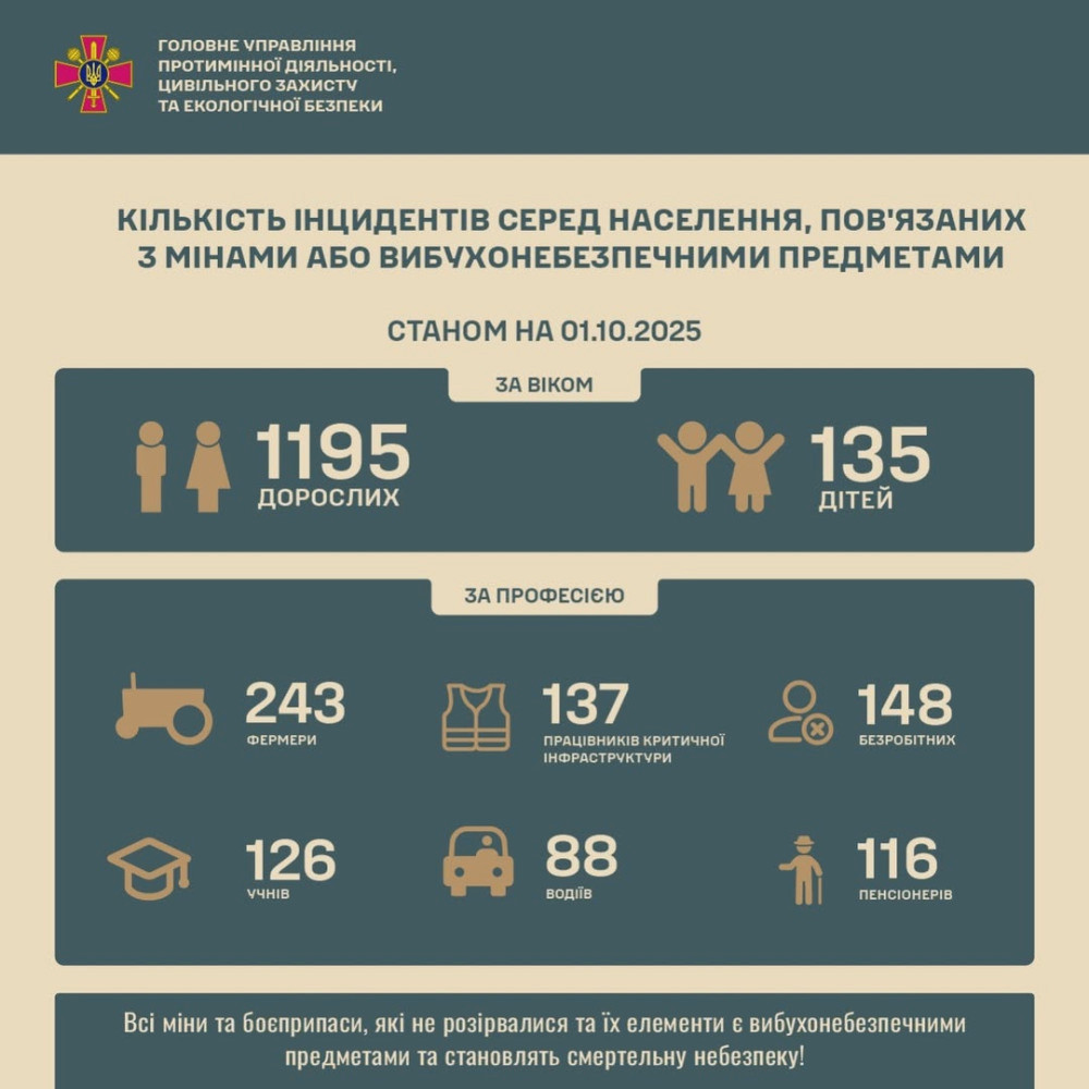 «По состоянию на 1 октября 2025 года из-за враждебных мин и взрывоопасных остатков войны пострадало 1 330 человек, из которых 135 – это дети, а 1 195 – взрослые», – говорится в отчете.